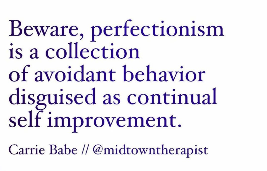 “Perfectionism is a dangerous path that requires us to be in constant criticism of the self…Self improvement on the other hand is motivated by a sense of love and respect for the self. ‘I want to look at myself and my parts and continue to grow, expand and heal.’ Where as the commitment to perfectionism is a commitment to invulnerability.”